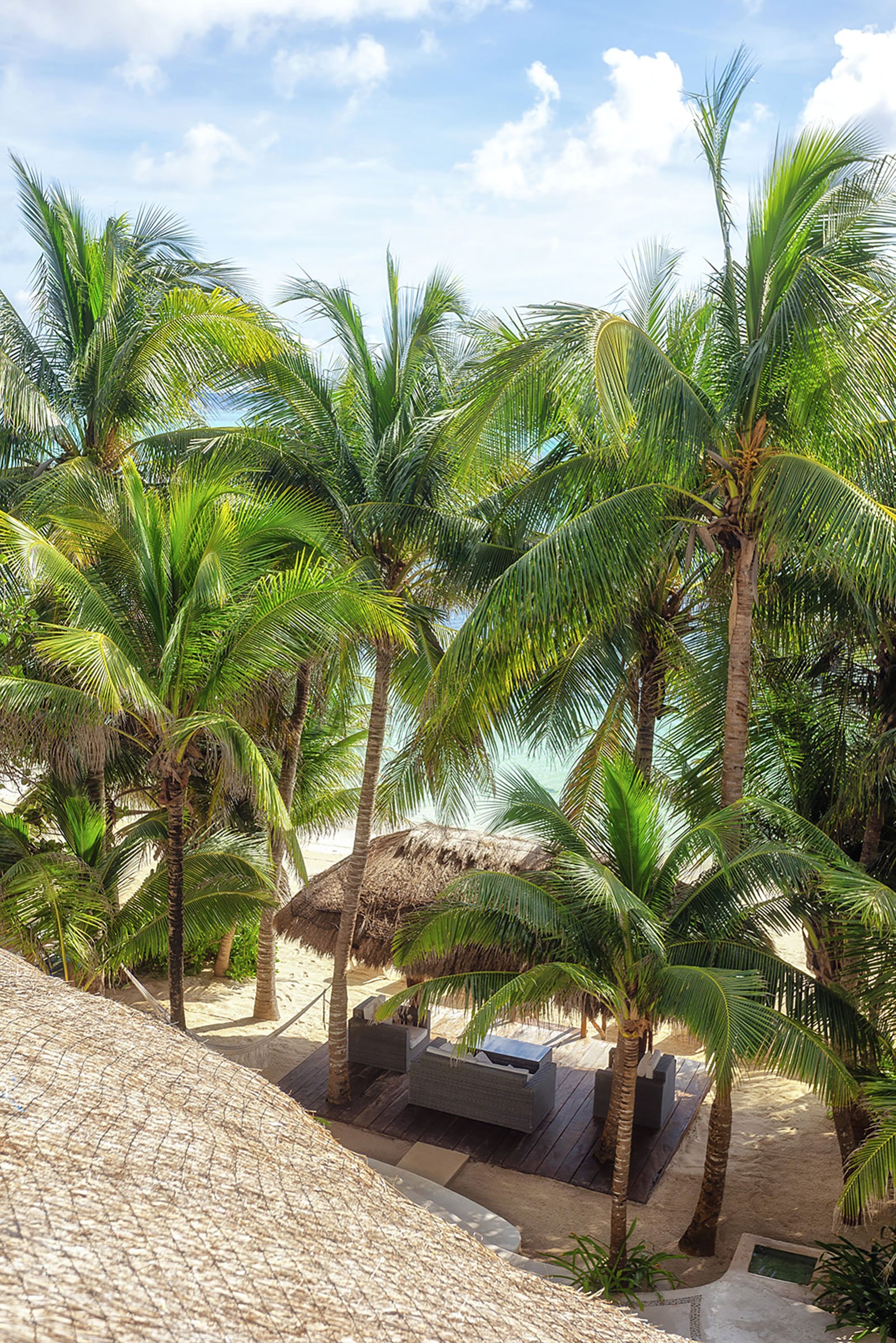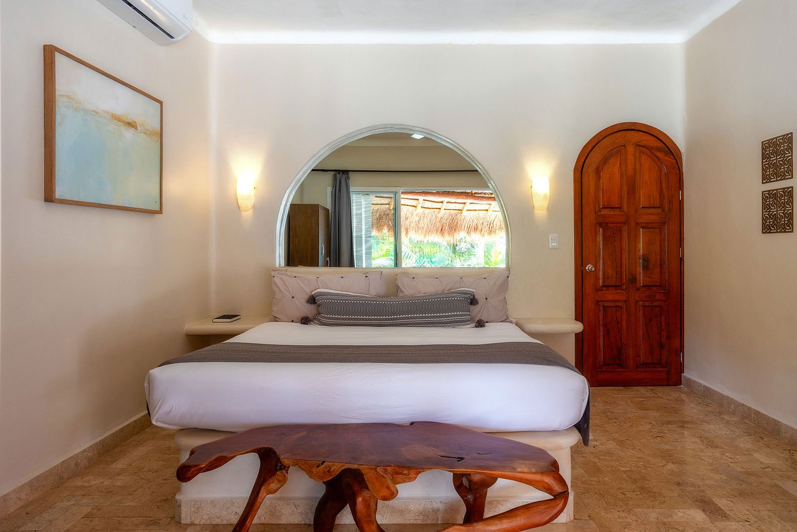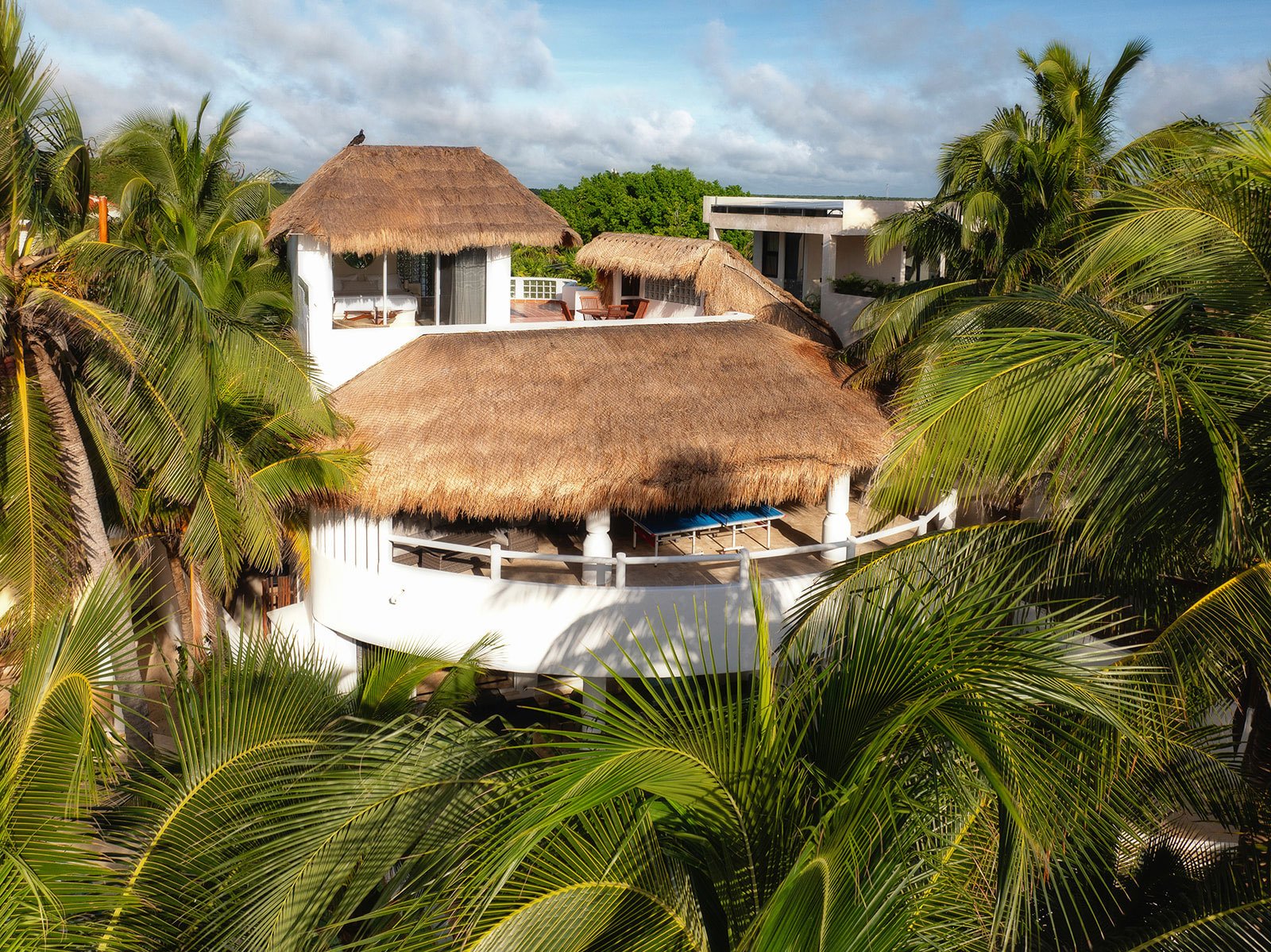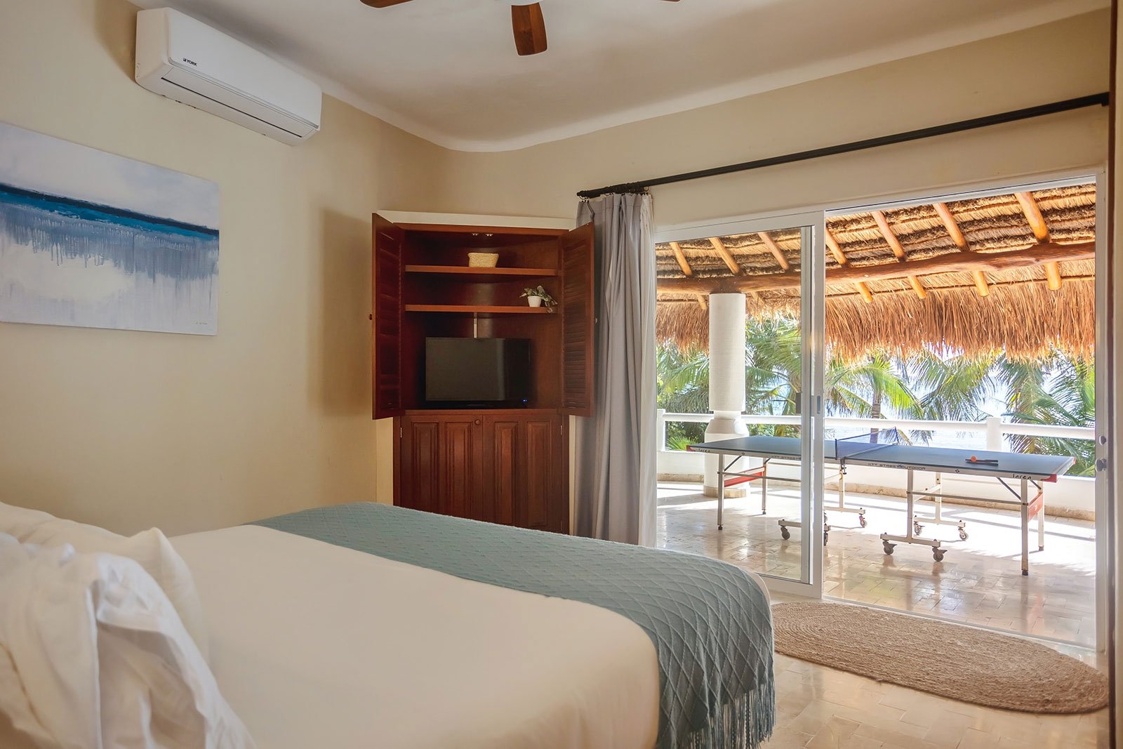 Take the exterior staircase to the rooftop master suite, set beneath a charming palapa. This romantic haven boasts its own private deck and offers sweeping views of both the Caribbean Sea and the lush tropical jungle—an elevated paradise where nature and comfort meet.