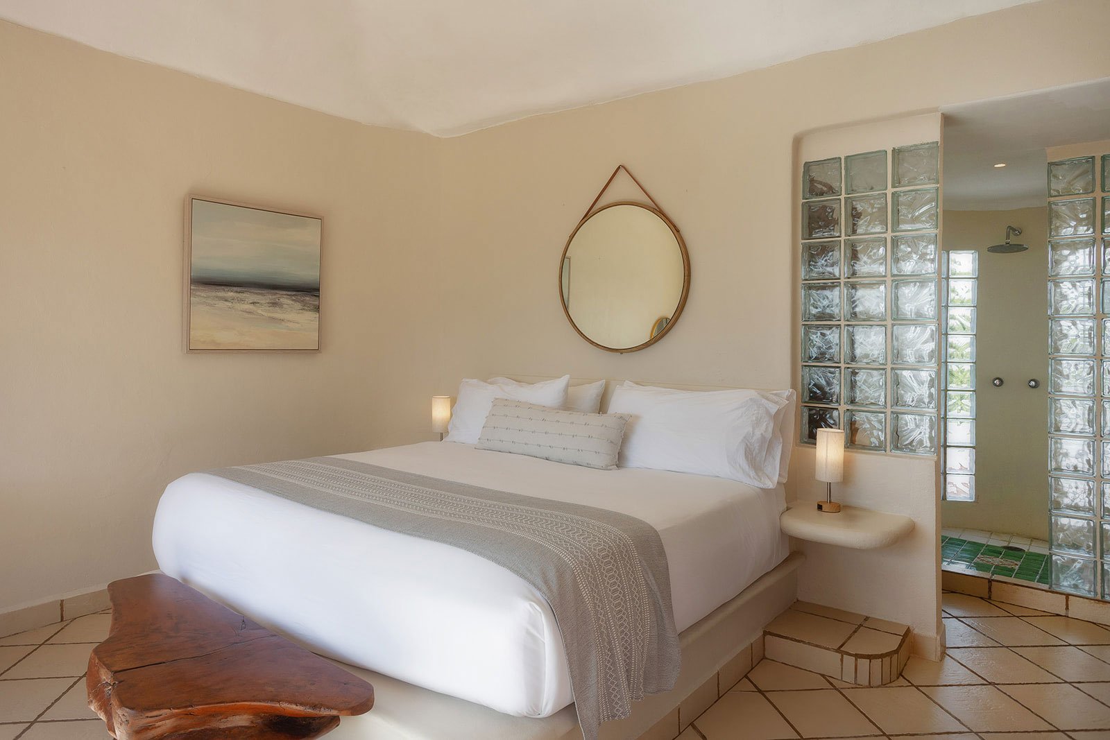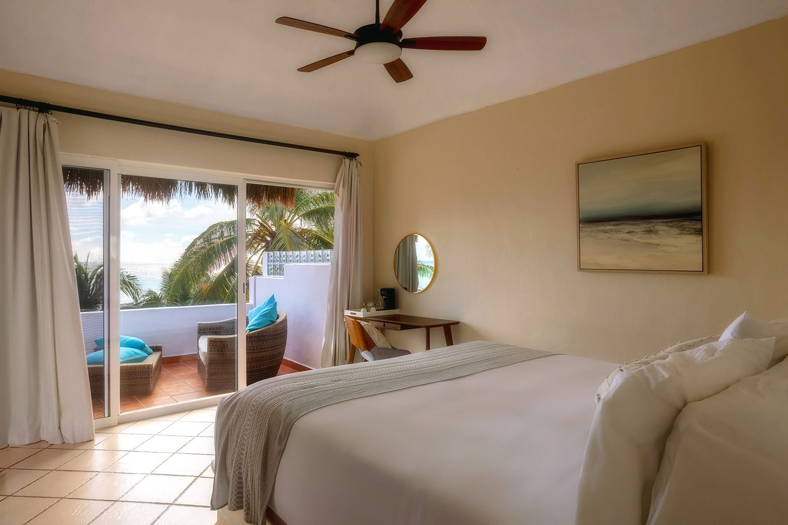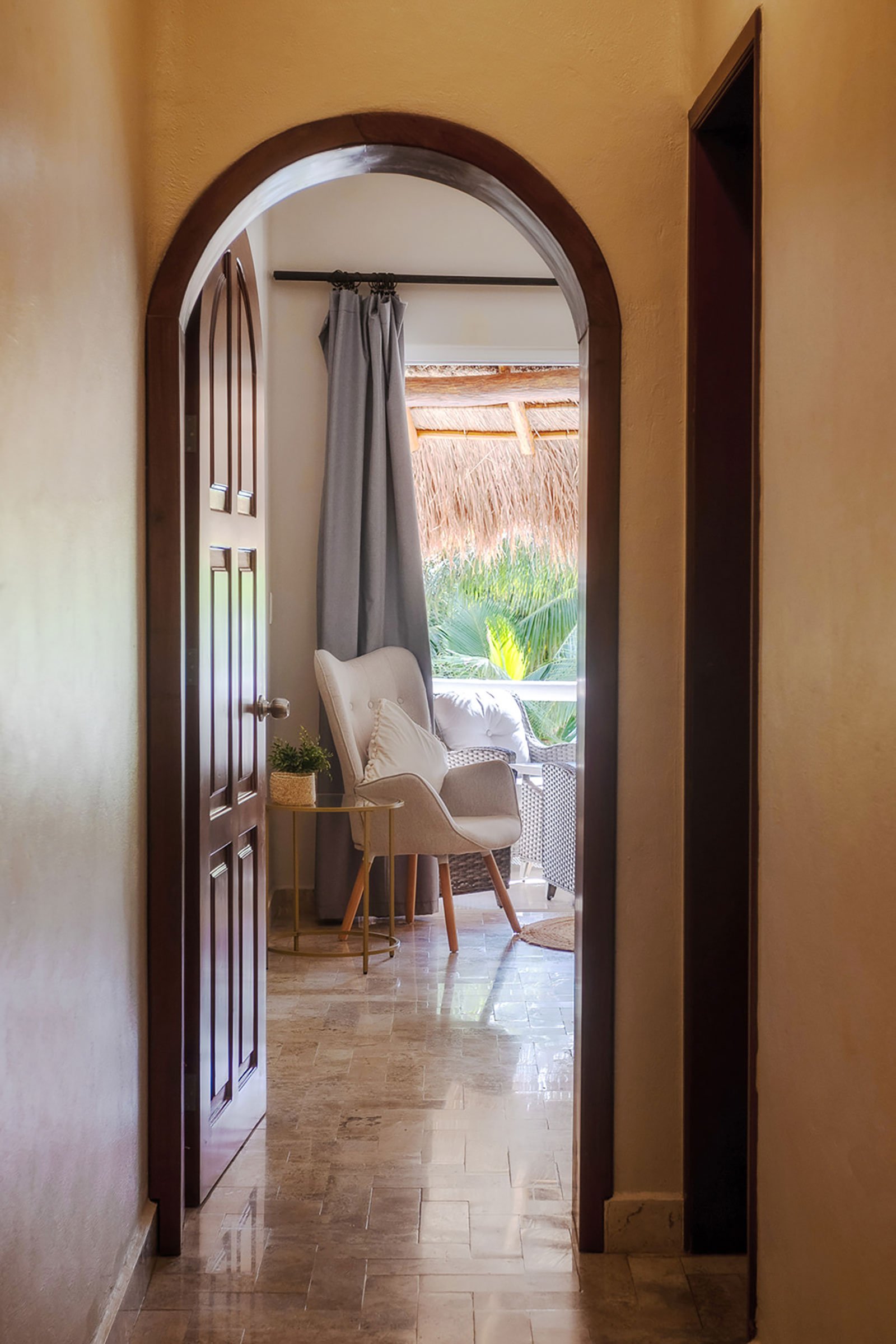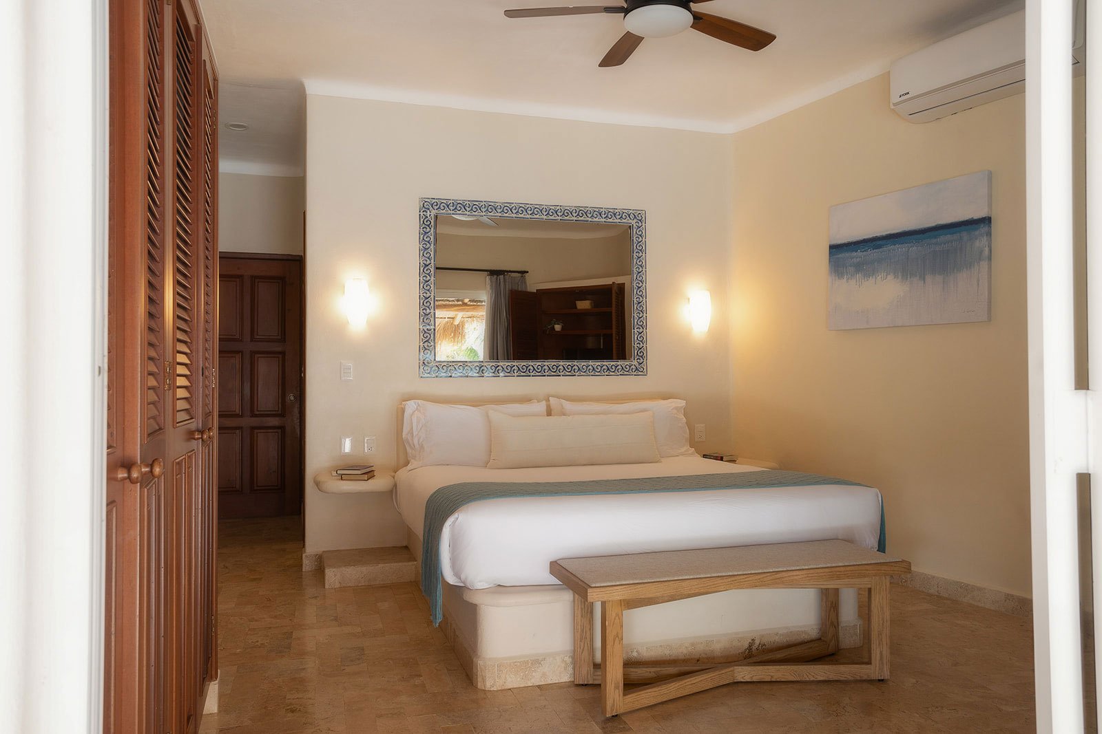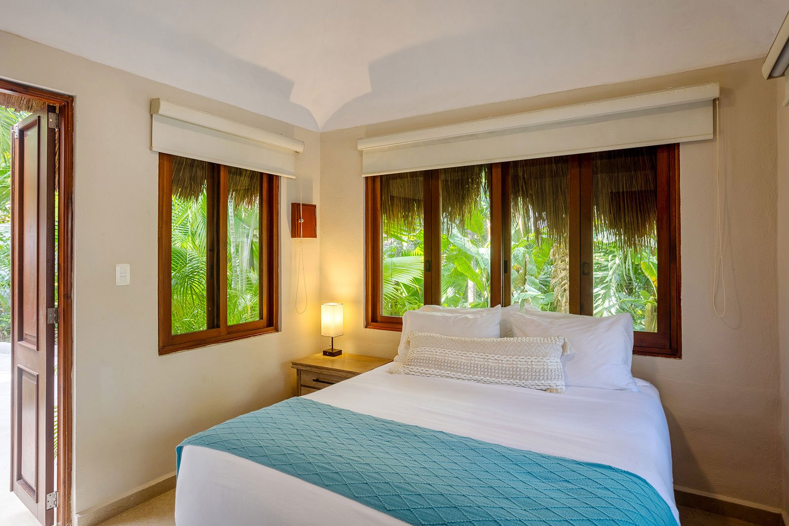 Take the exterior staircase to the rooftop master suite, set beneath a charming palapa. This romantic haven boasts its own private deck and offers sweeping views of both the Caribbean Sea and the lush tropical jungle—an elevated paradise where nature and comfort meet.