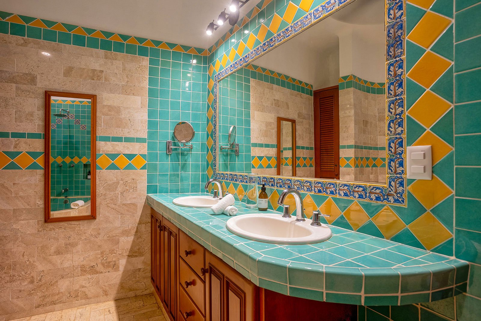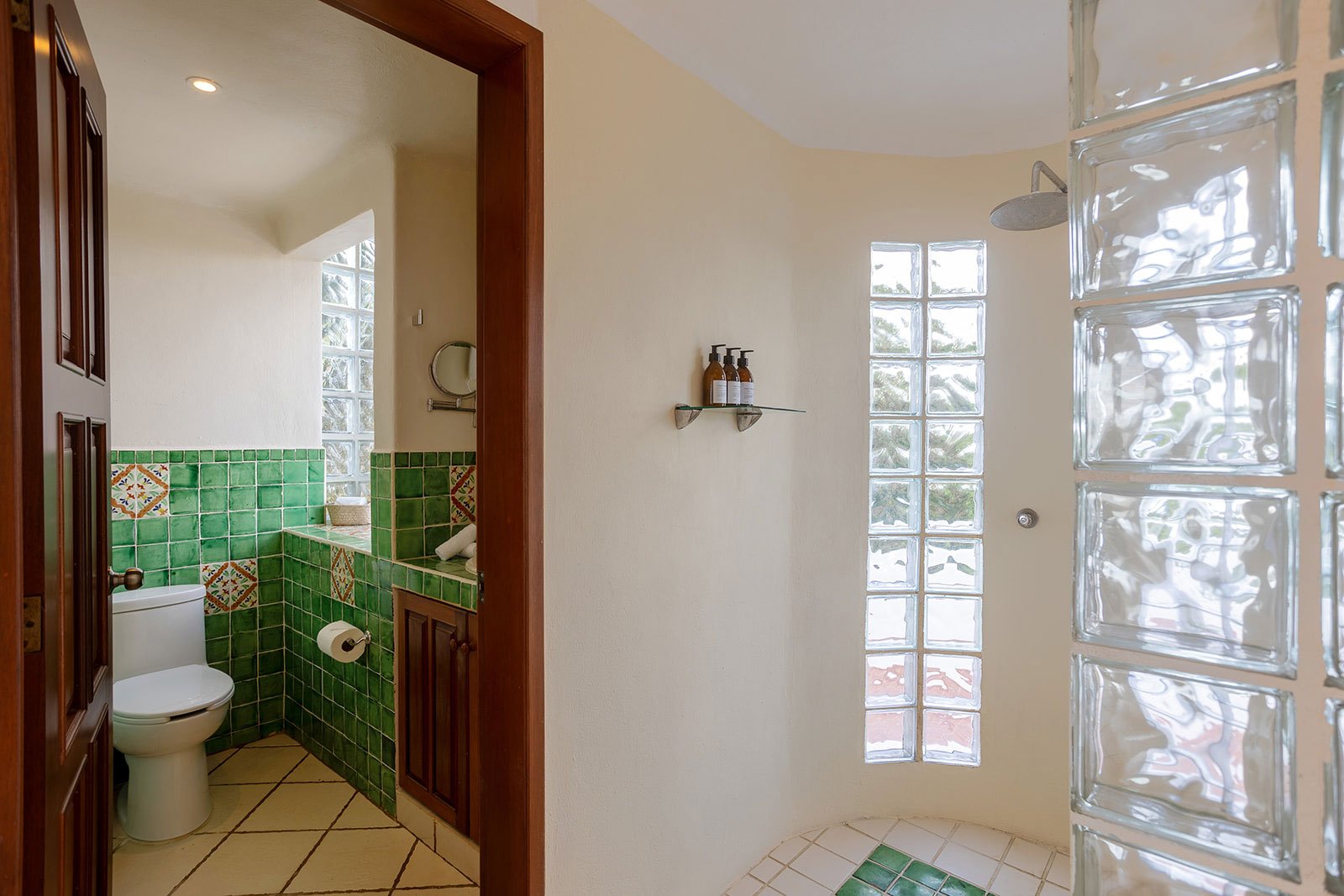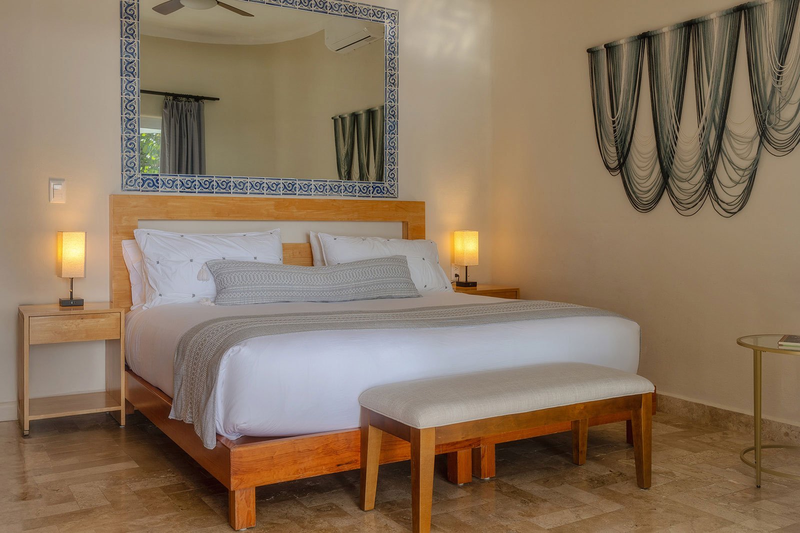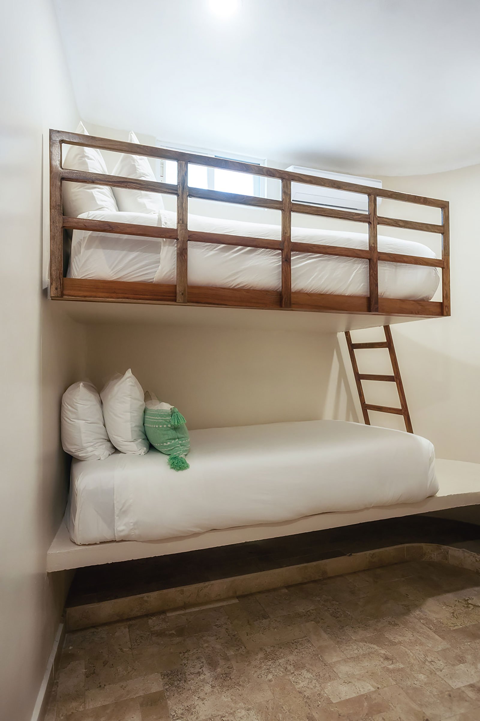 Inside, each of the villa’s four bedrooms offers breathtaking Caribbean views. The ground-floor bedroom includes an oversized king bed and two single bunk beds, perfect for families or guests who appreciate the added luxury of a private entertainment center with plasma TV. Upstairs, two additional king bedrooms offer spacious ensuite bathrooms and direct access to a large ocean-facing terrace.
